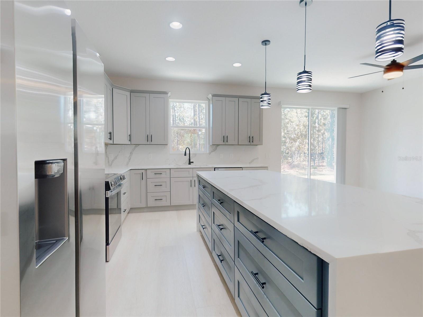 LARGE KITCHEN WITH PANTRY AND ISLAND WITH QUARTZ COUNTER TOPS. HOME FEATURES A UP GRADED