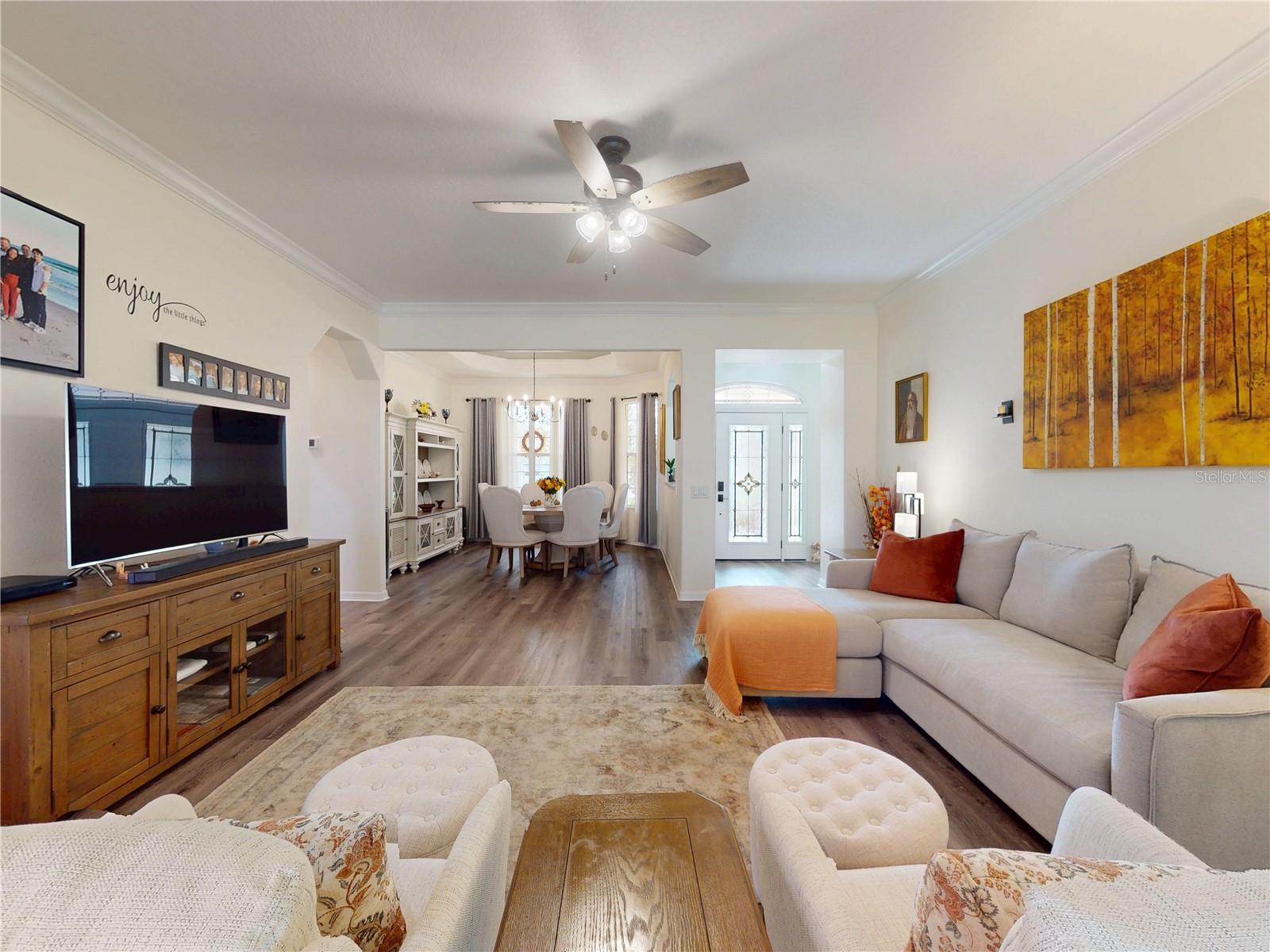 The entrance has a rocking porch and new stained-glass door. A place where luxury meets livability, every detail has been thoughtfully considered, from the professional landscaping to Vinyl Luxury Flooring throughout, custom crown moldings and unique lighting fixtures. The open-floor plan creates a seamless flow between living spaces while allowing each room its unique charm.